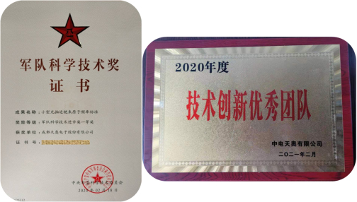 圖3 銫原子鐘獲軍隊科學(xué)技術(shù)進(jìn)步一等獎和中電天奧技術(shù)創(chuàng)新優(yōu)秀團(tuán)隊