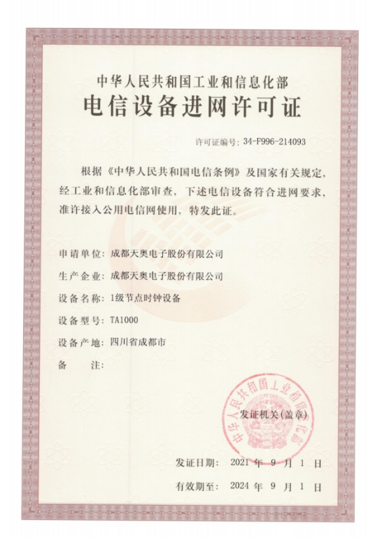 TA1000型1級節(jié)點時鐘設(shè)備成為國內(nèi)首款取得電信設(shè)備進網(wǎng)許可認證產(chǎn)品